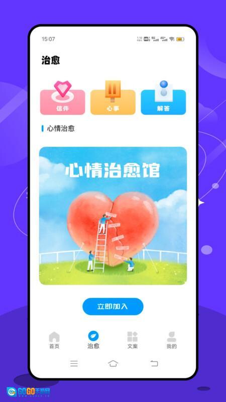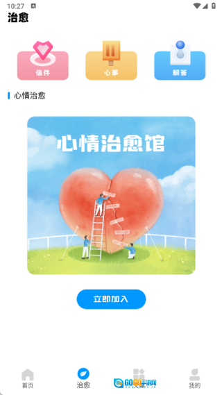 3、治愈页面设有信件、心事与解答三个版块,用户还能即刻加入心情治愈馆;