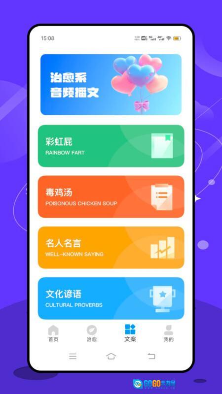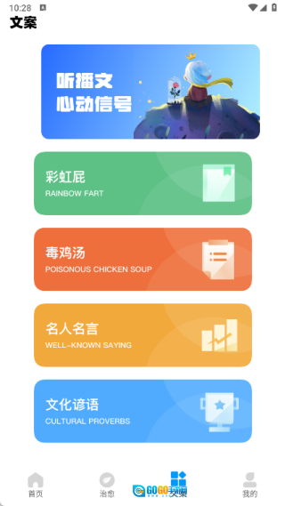 4、文案页面里设有彩虹屁、毒鸡汤、名人名言和文化谚语等多个不同版块。