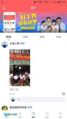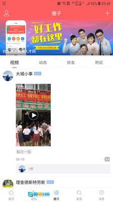 2、龚州网的应用圈子板块,可呈现本地精彩视频、好友动态、好友信息、附近动态以及最新推荐内容。
