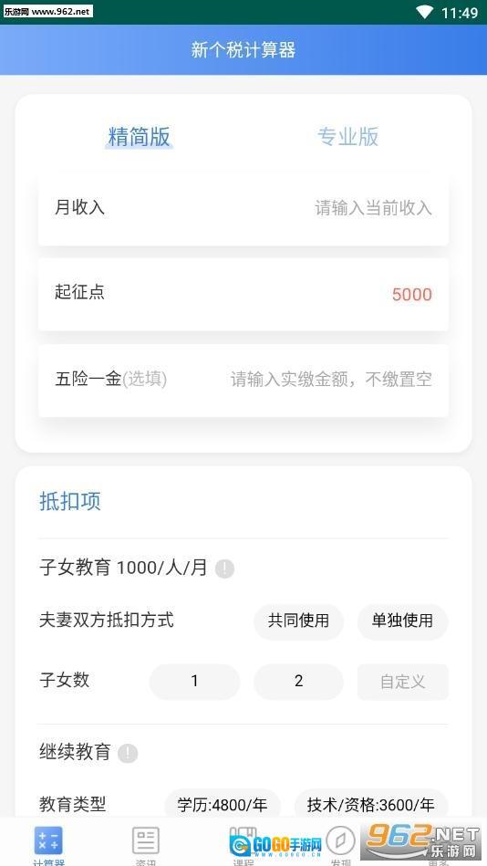新个税计算器包含精简版与专业版这两个计算器模块。其中,专业版支持对社保基数以及公积金基数进行自定义输入,用户能够输入自身当下的五险一金基数,进而获取计算结果。