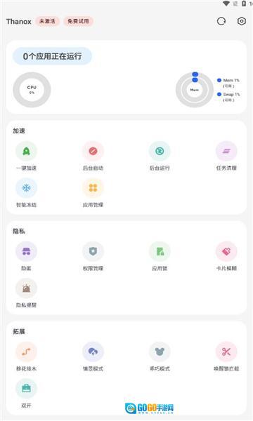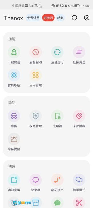 1、接着进入Thanox权限管理软件。在正式踏入该软件之前,我们有必要知晓软件大致的功能模式。其中,首当其冲的便是激活模式,毕竟不同模式下,用户能够探索到的功能存在差异。