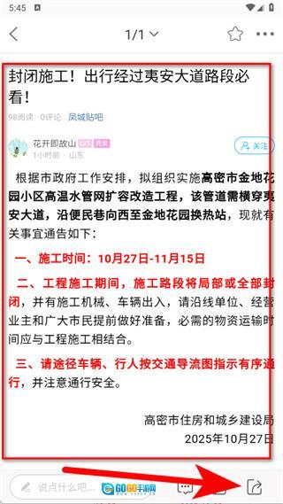 4、进入帖子详情页面后,点击页面右下角的分享图标,随即会弹出分享选项。