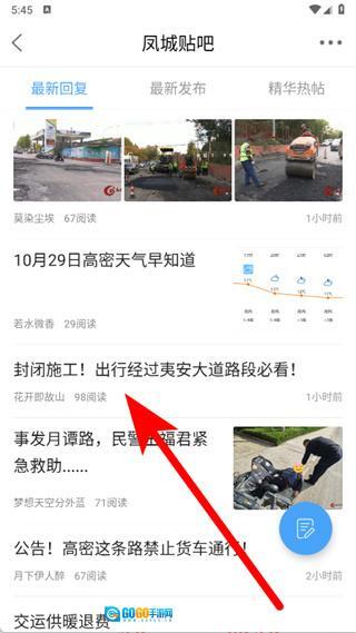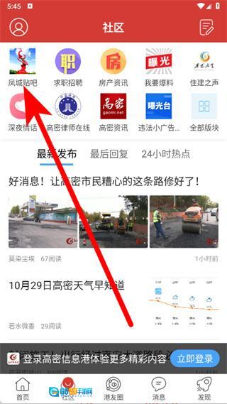 2. 在社区界面,轻点凤城贴吧,随即进入贴吧内容页面。