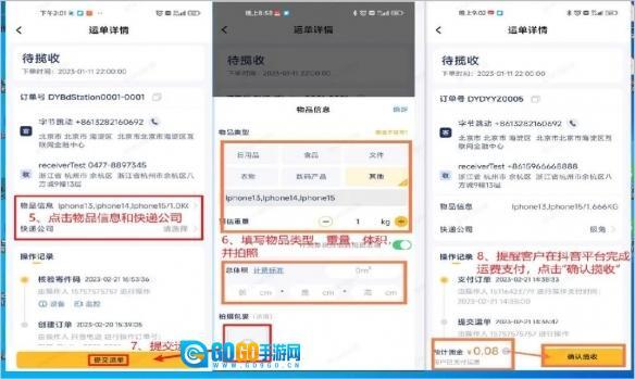 3. 轻点物品信息 - 快递公司,接着填写相关信息并拍照,随后提醒客户进行支付。
