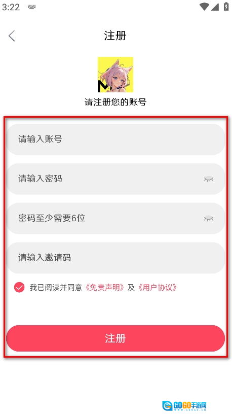 4.请输入账号、密码、再次输入密码,勾选我已阅读并同意《免责声明》及《用户协议》,再点击注册即可。