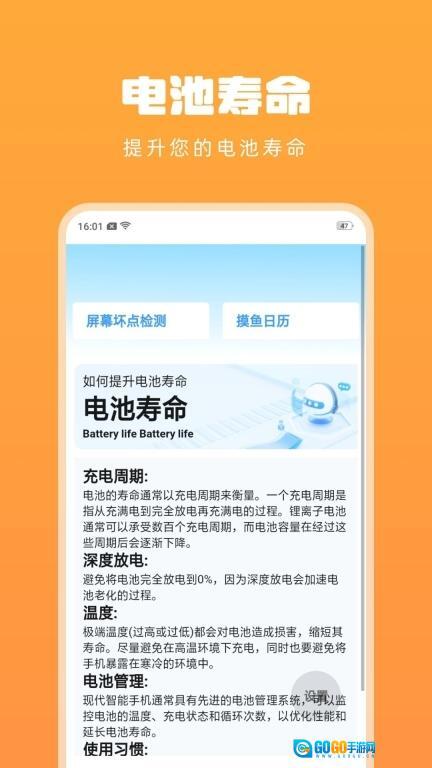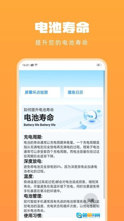 1. 具备电池健康检测功能,助力用户监测电池状态,适时对电池进行保养,从而延长其使用寿命。 2. 用户能够通过管理手机应用程序,关闭那些耗电量大的后台应用,以此降低耗电量。