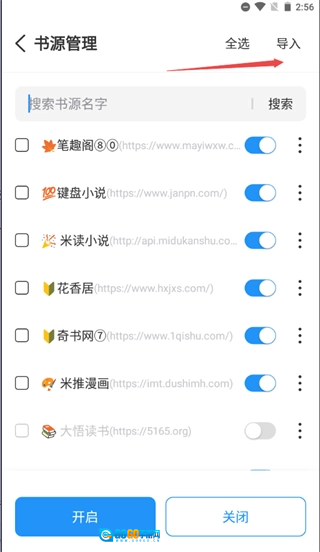 3、跳转到书源管理页面后点击右上方的导入按钮。