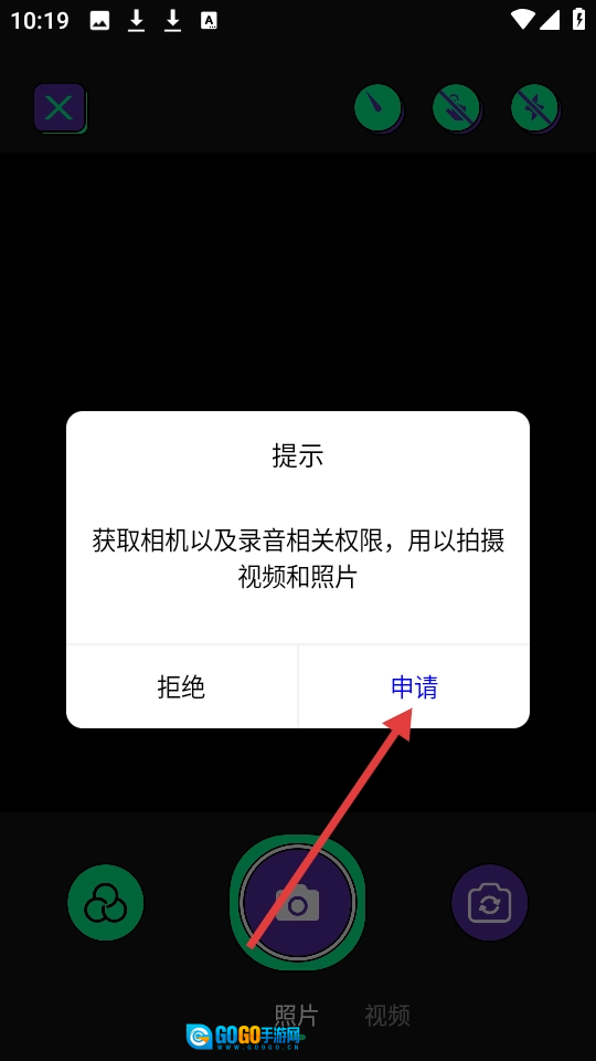在权限提示弹窗里,点击【申请】按钮来获取相机与录音权限,这些权限将用于拍摄视频和照片。