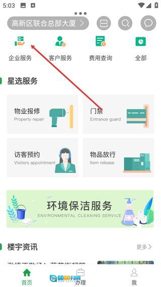 1、点击“企业服务”入口,即可进入企业相关服务的分类页面,首页还同步设有物业报修、访客预约等楼宇服务功能。