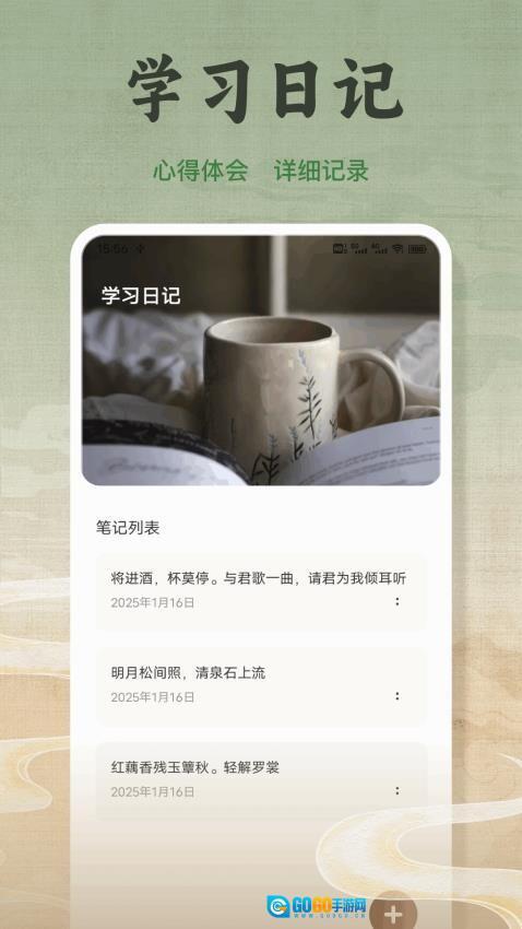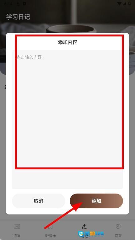 3、输入希望记录的诗词学习相关内容,接着点击添加按钮,即可完成笔记的创建。
