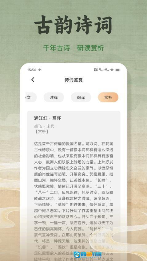 2、多维度解读助力文化理解:每首诗词除了基础的注释与赏析内容,还会关联地理、历史及艺术等领域的知识点,助力用户从多个角度深入领会诗词背后的文化内涵,而非仅仅停留在文字的表层含义。