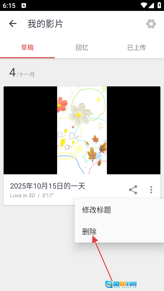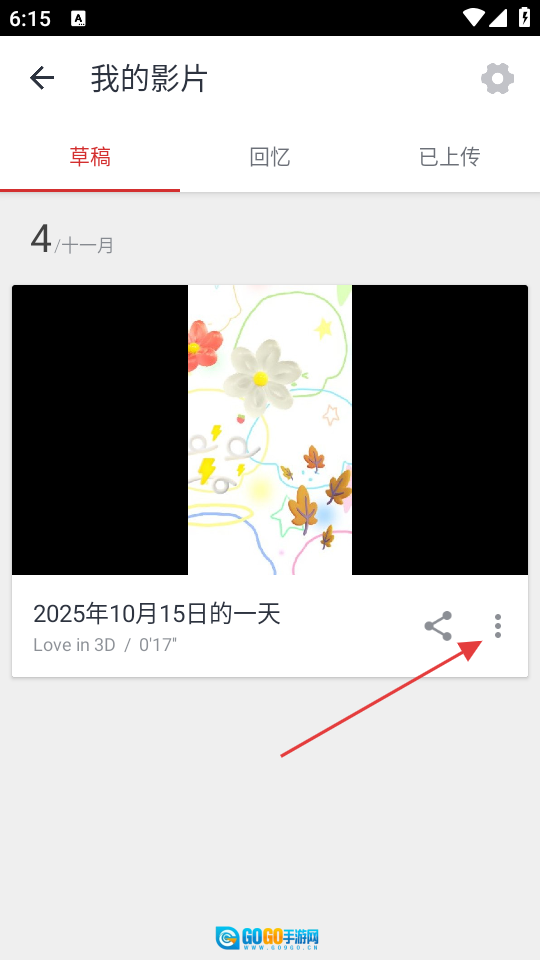 2、进入“我的影片”界面后,先选择草稿分类,找到需要删除的影片,点击该影片右侧的三点菜单按钮,即可弹出操作选项。