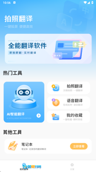 1、主页面集成了拍照翻译、语音翻译、我的收藏以及笔记本等功能;