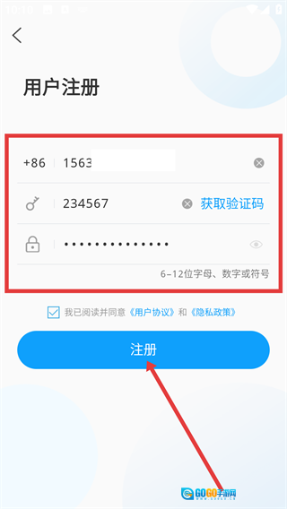 4、用户在注册页面依次输入手机号、验证码与密码,勾选同意相关协议后,点击【注册】按钮,就能完成注册流程。