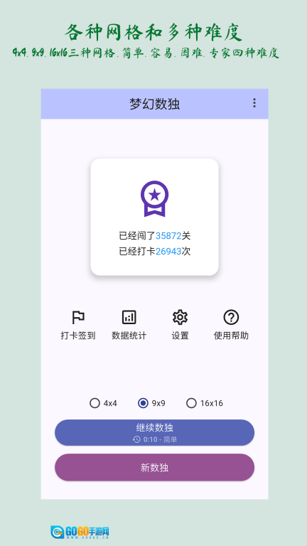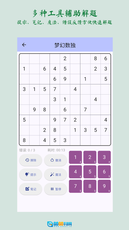 梦幻数独是一款由传统数独优化升级而来的软件,它提供简单、容易、困难、专家四种难度等级供用户选择,且每种难度下都有三种不同的网格类型可供挑选。这款软件包含的数独知识学习资源极为丰富,能够轻松满足用户在数独学习方面的全方位需求。对数独感兴趣的朋友们,快来体验一下吧!