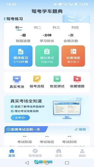 安装完成后进入首页,在驾考练习板块中能够看到从科目一到科目四的全部题目分类。