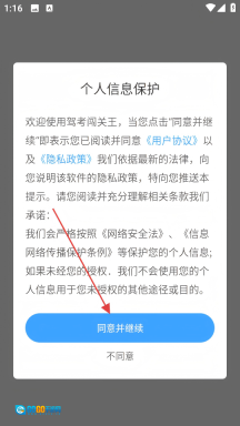 1、仔细阅读【个人信息保护】提示内容后,点击界面上的【同意并继续】按钮,即可进入驾考软件的主界面。