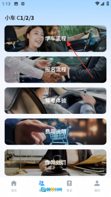 3、在报名页面找到并点击【学车流程】选项,即可进入学车流程的详情页面。
