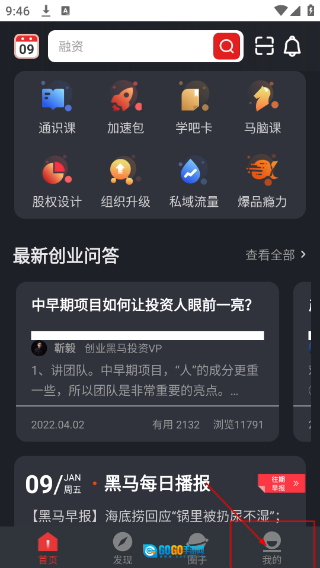 1、首页设有【通讯课】-【加速包】等功能,还能查看创业问答内容,点击底部【我的】即可进入个人相关操作板块。
