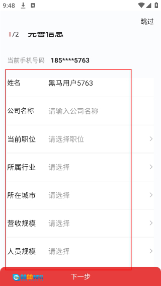 4、完善信息页需补充【公司名称】-【当前职位】等信息,当前手机号已显示,填好后点击【下一步】完成信息完善。