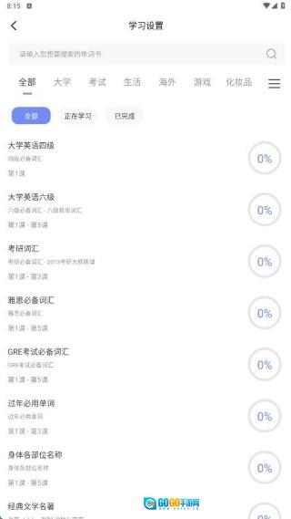 3、平台所支持的单词书十分丰富,涵盖了从小学、中学到大学的全部学习阶段。