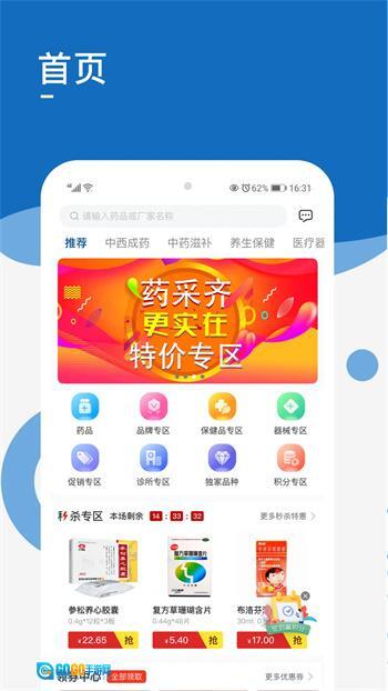 平台通过多样化的让利服务,为用户提供更具吸引力的专享惊喜价格,同时全场商品支持全程包邮。平台所售商品种类丰富,包括中药、西药以及各类滋补保健产品等,并且采用闪电配送模式,让用户能够体验到当日送达的便捷服务。