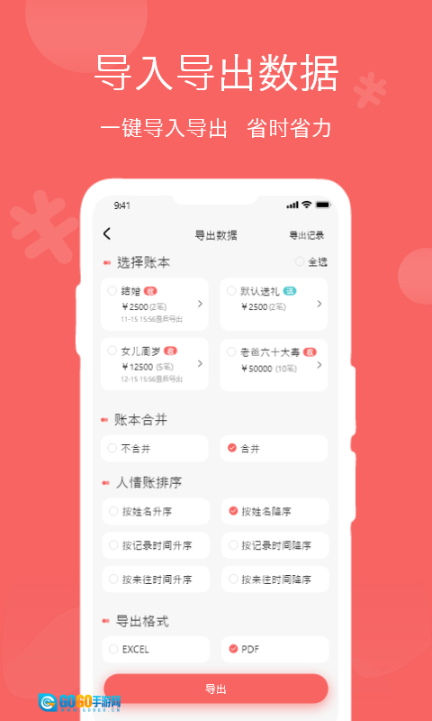 【导出人情帐】可随时导出全部人情帐记录,帮您轻松查账无烦恼。