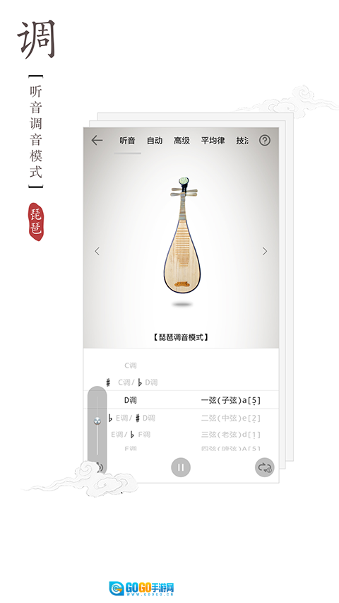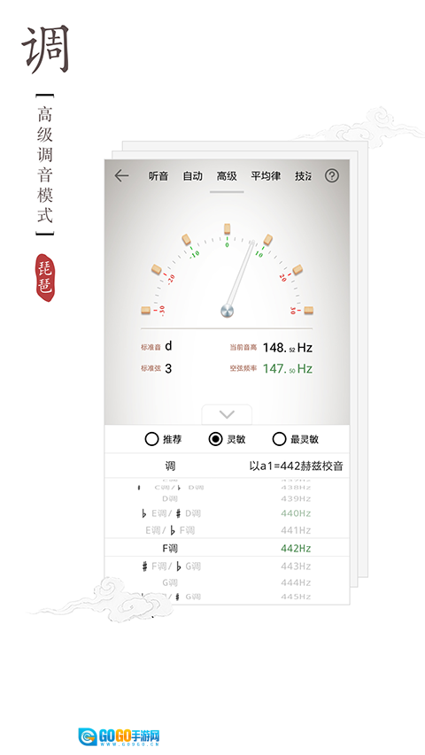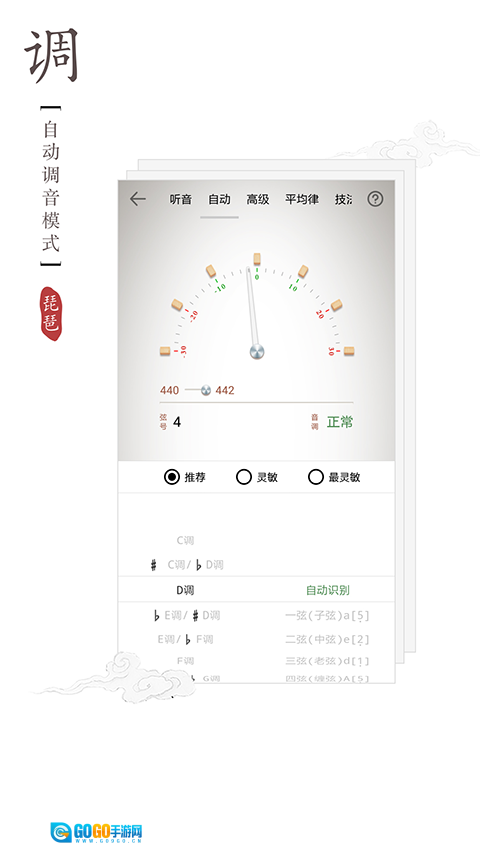 1、多模式调音体系:包含听音、自动、高级、技法四种模式,匹配不同学习阶段的需求,可支持D调、F调等常规调式以及特殊曲目的调弦操作。