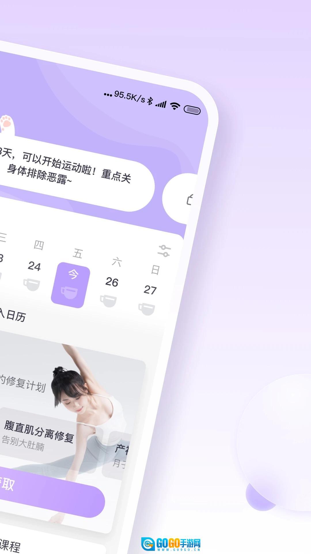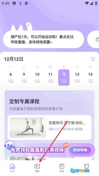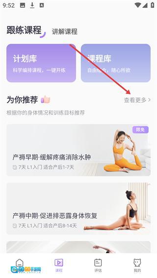 1、打开产后修复类应用,进入首页后点击底部的【课程】选项,就能进入课程分类与推荐页面。