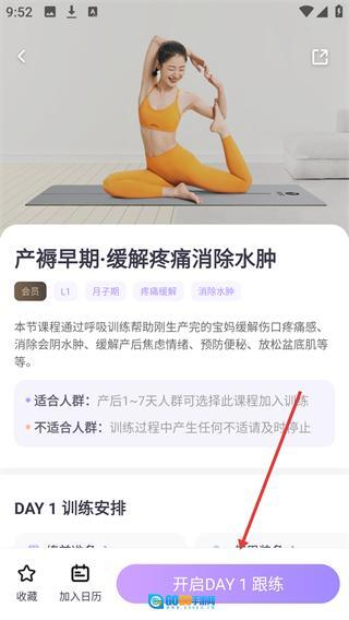 4、进入课程详情页后,先确认课程的适配人群,接着点击【开启DAY 1跟练】按钮,就能进入课程的训练环节了。