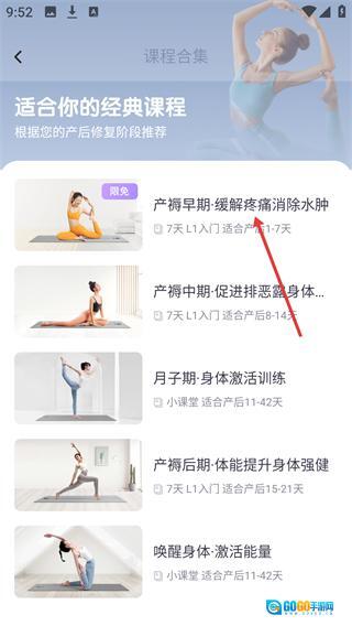 3、进入课程合集页面后,找到并选择与自身产后阶段相匹配的课程(例如“产褥早期·缓解疼痛消除水肿”这一课程),接着点击该课程进入其详情页面。