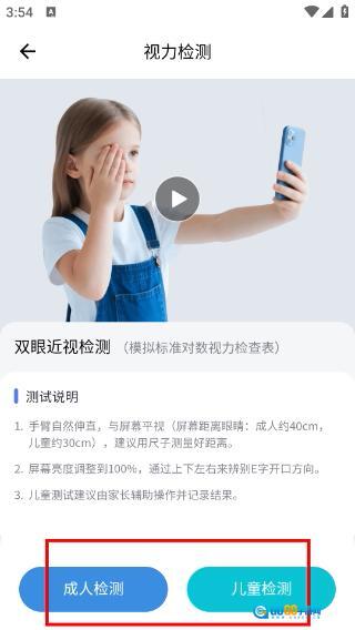 3、进入【双眼近视检测】页面后,首先查看测试说明,按照要求调整好姿势和屏幕,然后选择【成人检测】或【儿童检测】选项来启动测试。