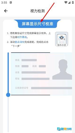4、在开展视力检测之前,要先完成【屏幕显示尺寸校准】这一步骤,具体操作是用身份证对齐边缘,填写相关信息后点击“下一步”,这样就能完成校准了。