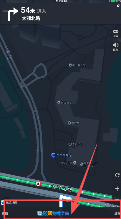 3、进入实时导航界面即可根据导航路线行驶或设置。