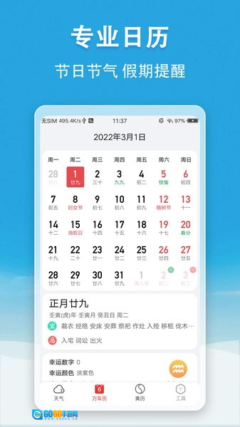 日历黄历:月视图、周视图、黄历宜忌、节假日查询、日程管理等功能一应俱全。