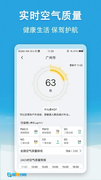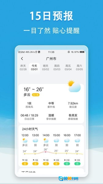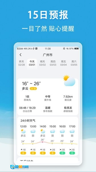 提供实时天气、分钟级降雨提示、24小时和15日天气预报、预警信息、空气质量、生活指数等详细信息。