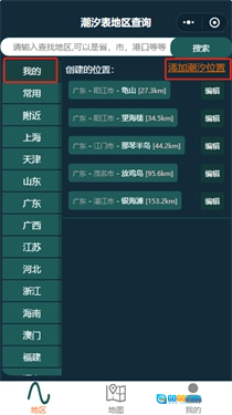你可以通过首页(地区)里的“我的”→“添加潮汐位置”来新增位置,添加好之后能在“我的”列表里找到;其实“地图”页面也能查看新增的位置,不过因为我之前忘了做刷新功能,所以得重新打开软件才能显示,这个BUG会在下个版本修复。