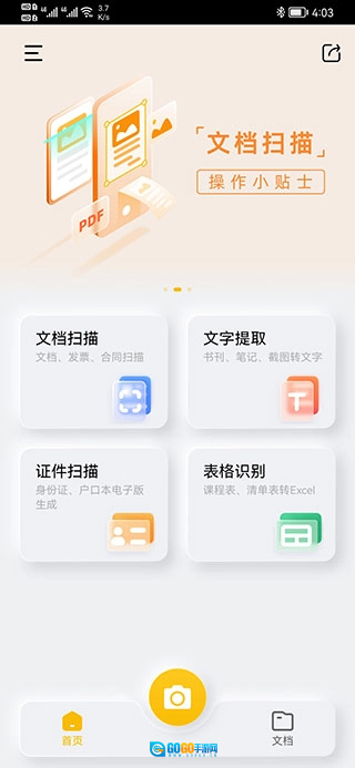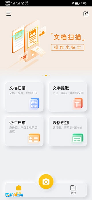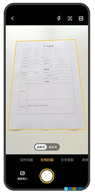 2、打开相机后,可以选择证件扫描、文档扫描、文字提取、表格识别,同时支持拍单页和多页,还可以从相册里导入。