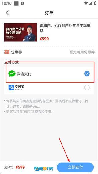 5、进入订单支付页面后,先选定支付方式,再点击“立即支付”按钮,即可完成课程购买的全部流程。