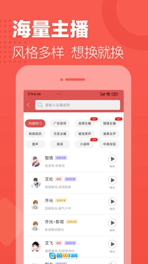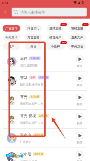 2、挑选你钟爱的主播声音风格,像轻柔女声、稳重男声或是俏皮童音,先试听一下看看效果合不合适。