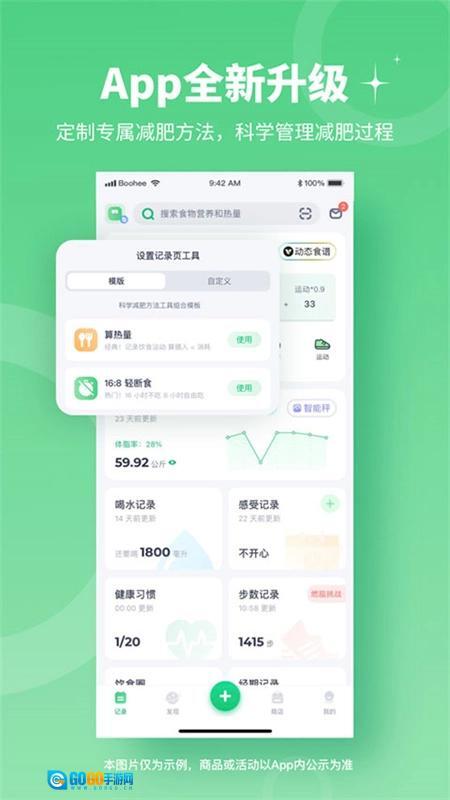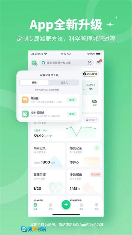 1、科学健康地高效管理减肥过程 量身定制减肥方案与减脂食谱,记录体重、体脂、围度等多维度数据变化,贴合中国饮食习惯,实现健康高效的减肥管理。
