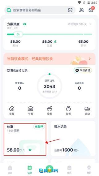 1、进入到应用之后找到记录页面点击体重选项。