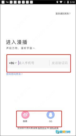 1、在本站漫播广播剧平台,打开后选择账号登录,支持使用手机号、微博、QQ三种登录方式。
