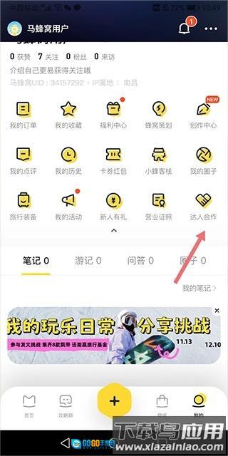 1、提交入驻材料:填写企业相关信息,提交公司资质文件,然后等待审核;用户可以在马蜂窝App的【我的】页面中点击【达人合作】选项。