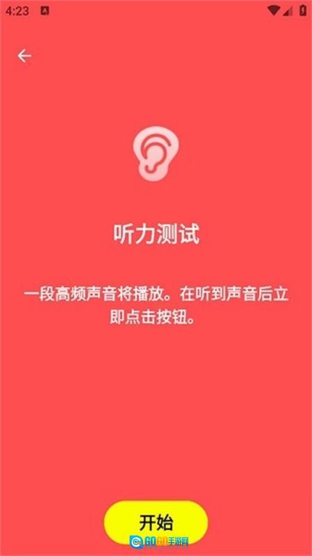 • 若您希望测试听力,可点击“听力测试”选项。请佩戴耳机,在听到“滴”的提示音后马上按下按钮,应用程序便会呈现您能感知到的最高音频频率。
