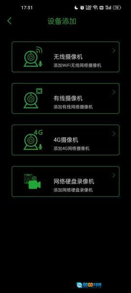 3、接着选择您需要添加的设备,依据您摄像头的类型来添加,这里提供无线摄像机、有线摄像机、4G摄像机、网络硬盘录像机这四种类型的设备。