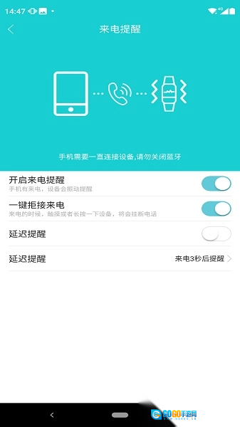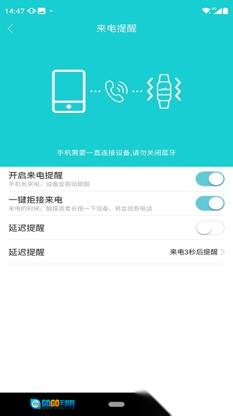 3. 开启短信提醒功能后,手环会借助震动来提示手机的来电和短信信息。