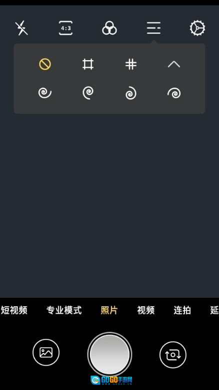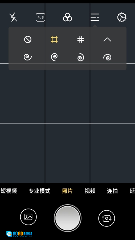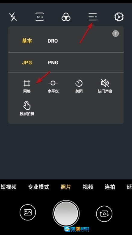 3、接着我们点击顶部的菜单按钮,用户能够自行设置照片的格式、拍摄模式、网格、水平仪、定时器等各项功能。