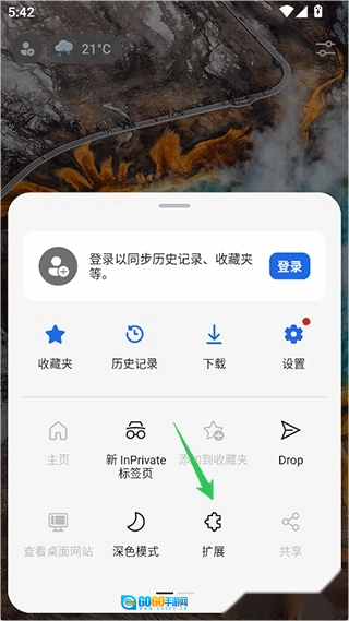 1、以手机版Edge Canary为例,打开Edge Canary安卓版后,点击右下角的扩展功能图标(即下图中绿色箭头所指的位置)