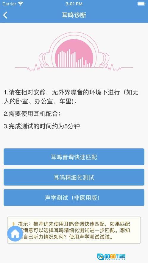 2.进入“耳鸣诊断”模块,按照提示进行声学测试。